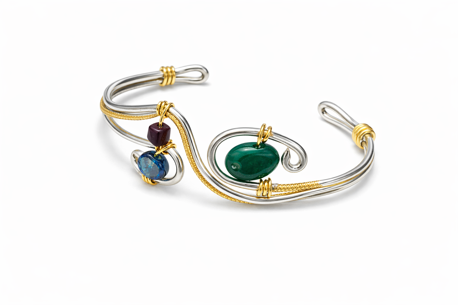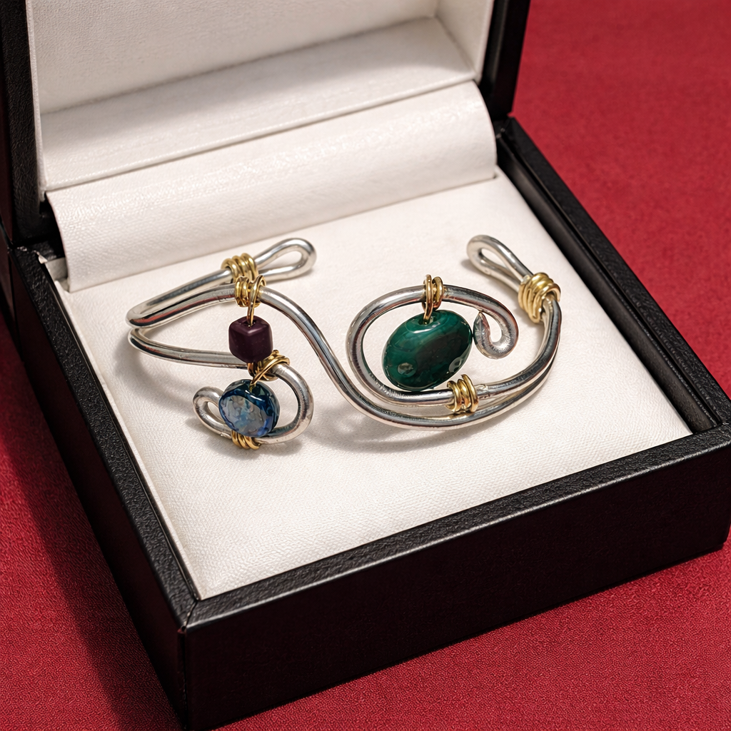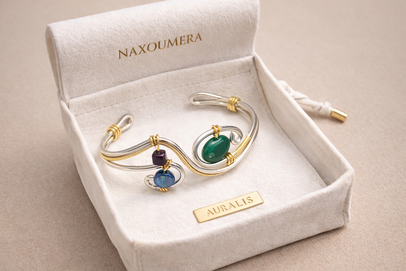 Auralis est un bracelet qui séduit par l’harmonie de ses courbes et l’éclat de ses pierres lumineuses. Son design mêle avec finesse l’or et l’argent dans un mouvement fluide, presque vivant, qui évoque la grâce naturelle et l’élégance intemporelle. Les touches de bleu, de vert et de violet viennent illuminer l’ensemble comme des reflets précieux, apportant à la création une aura délicate et singulière.