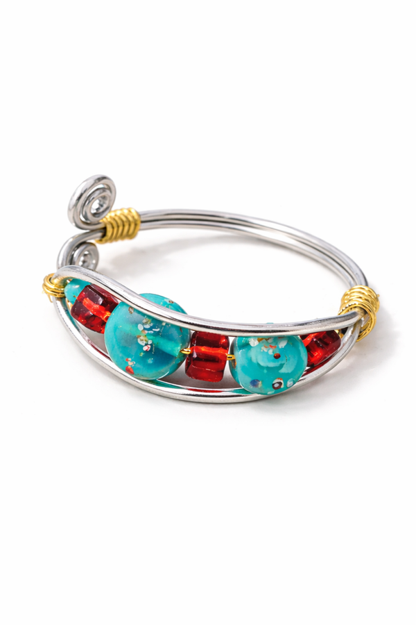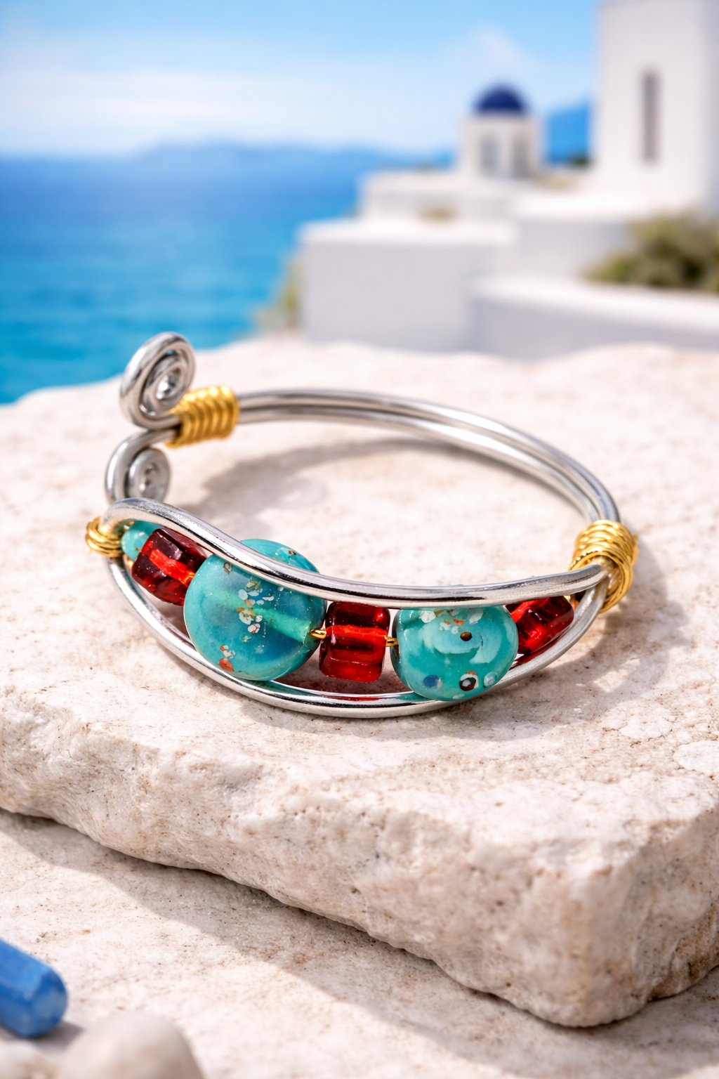 Inspiré par les reflets lumineux de la mer Égée, ce bracelet évoque la rencontre entre la profondeur des eaux turquoise et l’éclat chaud des couchers de soleil sur les îles grecques. Ses nuances vibrantes, mêlant le bleu de la mer au rouge intense de la lumière, lui confèrent une présence à la fois solaire, raffinée et pleine de caractère.