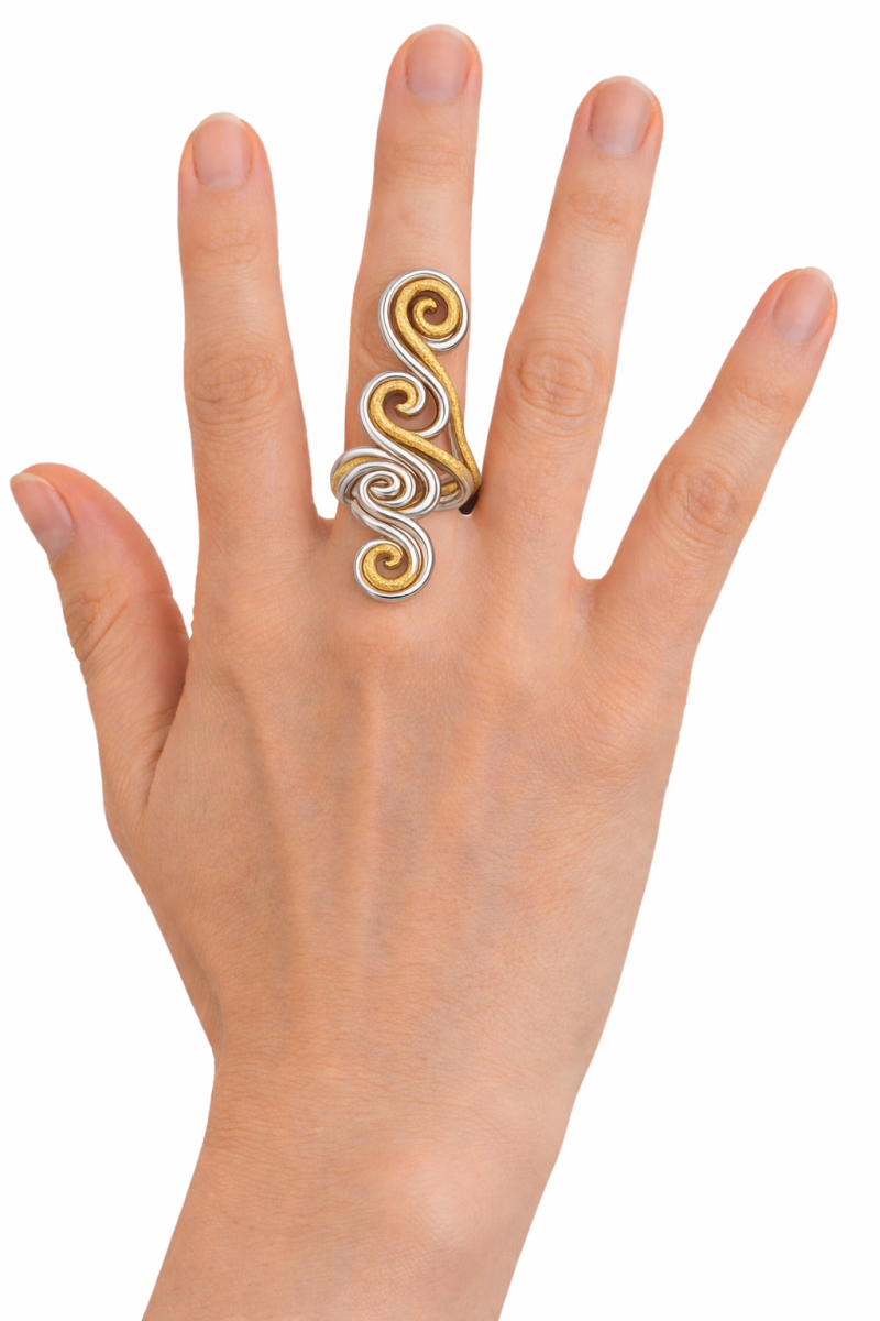 Κάθε δαχτυλίδι κατασκευάζεται στο χέρι με σχολαστική ακρίβεια. Ο συνδυασμός του ανάγλυφου χρυσού και του γυαλισμένου ασημιού αποκαλύπτει μια διακριτική και εκλεπτυσμένη αντίθεση, αιχμαλωτίζοντας το φως σε κάθε κίνηση.
