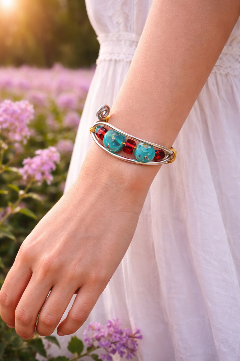 Οι λεπτές του γραμμές σε ασημί και χρυσές αποχρώσεις σχηματίζουν μια ρευστή κίνηση, σαν κύμα που το παρασέρνει ο άνεμος, ενώ οι χρωματιστές πέτρες του θυμίζουν φυσικούς θησαυρούς και τη ζωντανή ομορφιά των αιγαιοπελαγίτικων ακτών. Αυτό το βραχιόλι δεν είναι απλώς ένα κόσμημα· είναι μια πρόσκληση για ταξίδι, μια μεσογειακή πνοή φορεμένη στον καρπό.