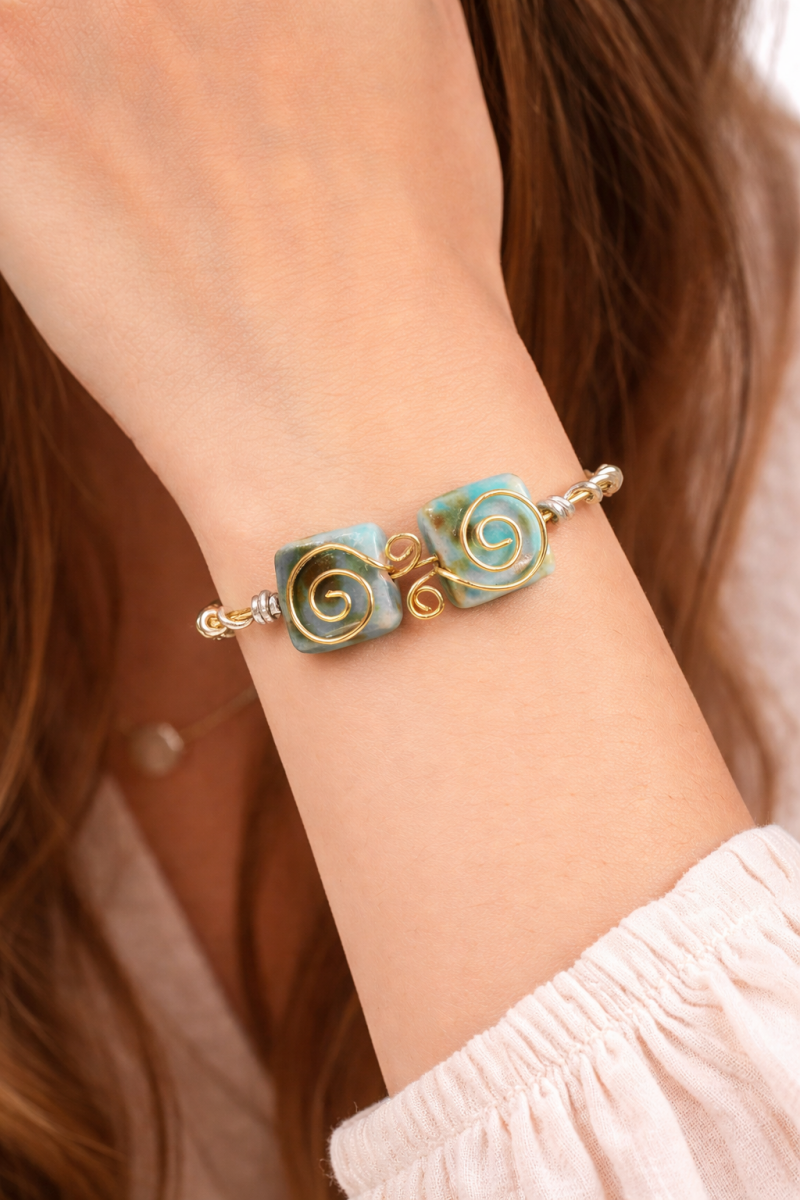 Η τιρκουάζ πέτρα είναι ιδιαίτερα δημοφιλής για τις φυσικές της αποχρώσεις και τη διαχρονική της αισθητική. Το βραχιόλι TiponAstra αναδεικνύει τη φυσική πέτρα μέσα από έναν μοναδικό χειροποίητο σχεδιασμό που τραβά το βλέμμα χωρίς υπερβολές.